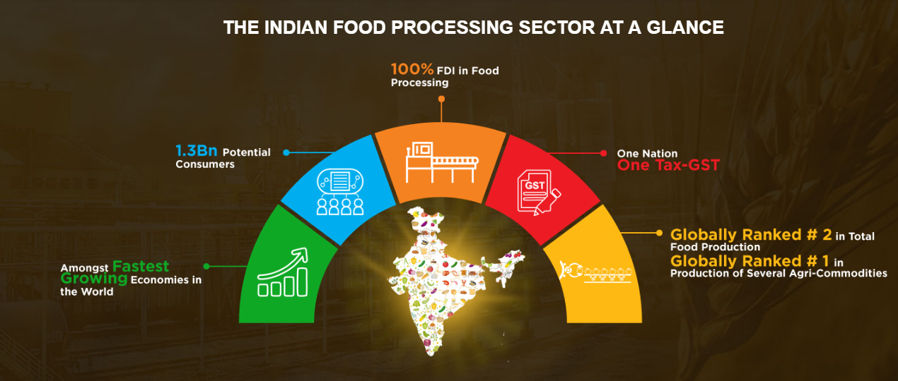 - The Indian government wants to fuel growth in the food processing sector by leveraging reforms like 100% foreign direct investment (FDI) in food marketing and various incentives at the federal and state levels, as well as a strong emphasis on supply chain infrastructure.